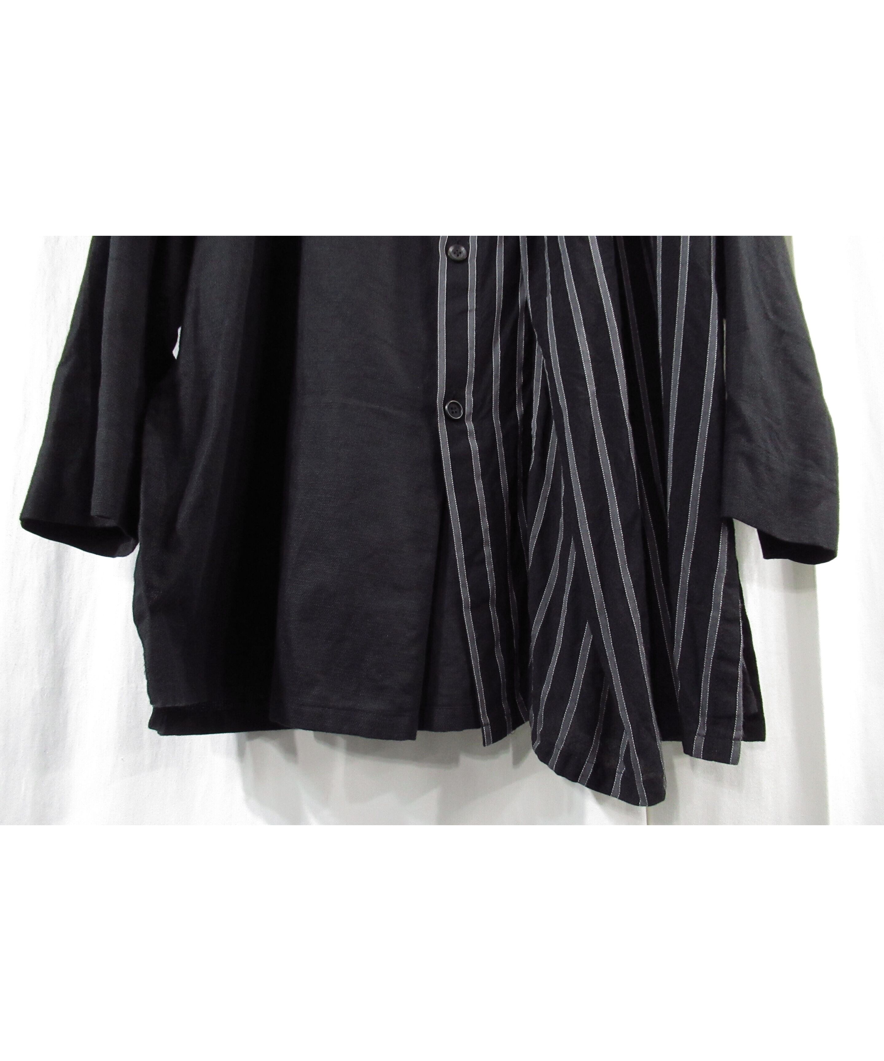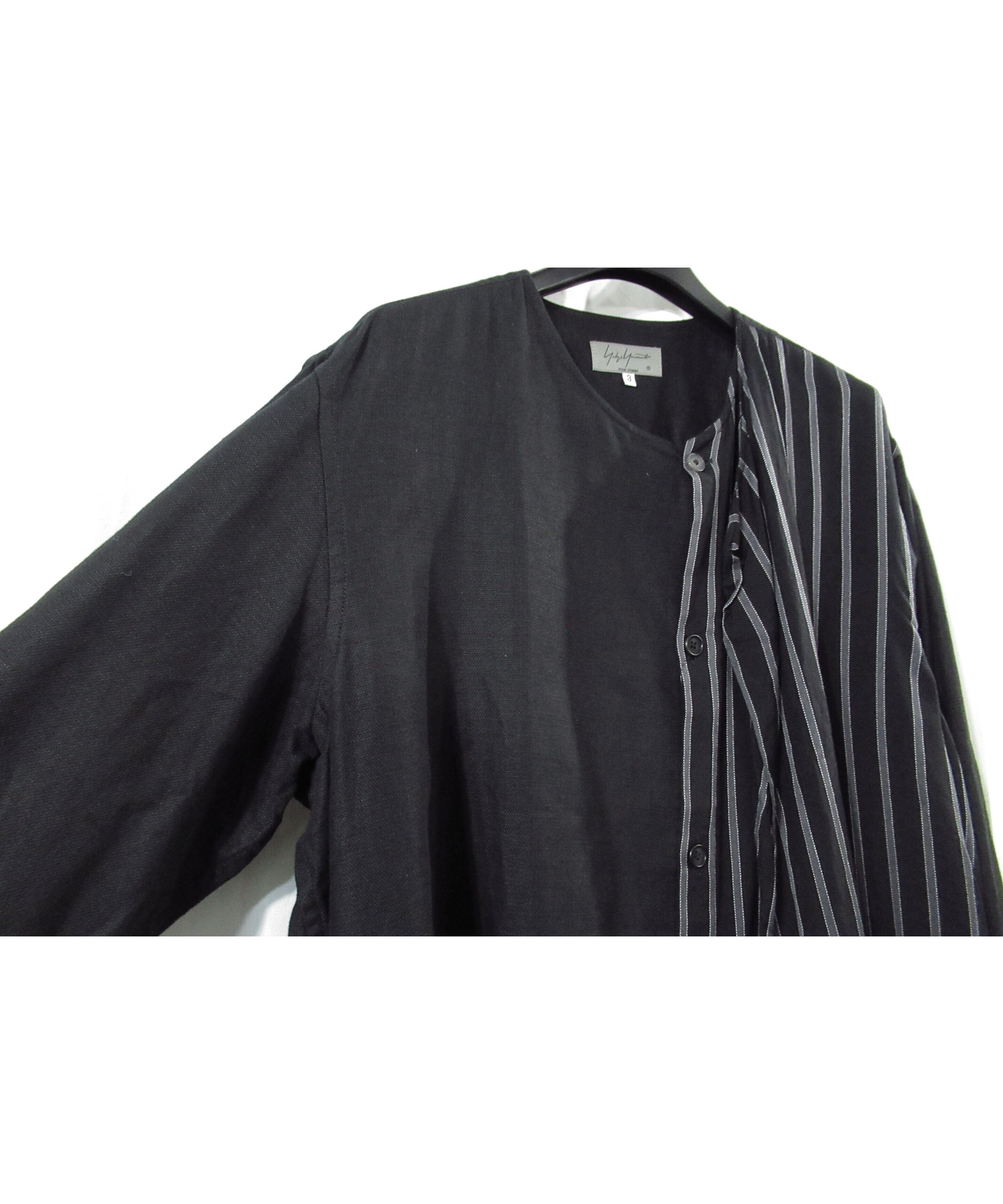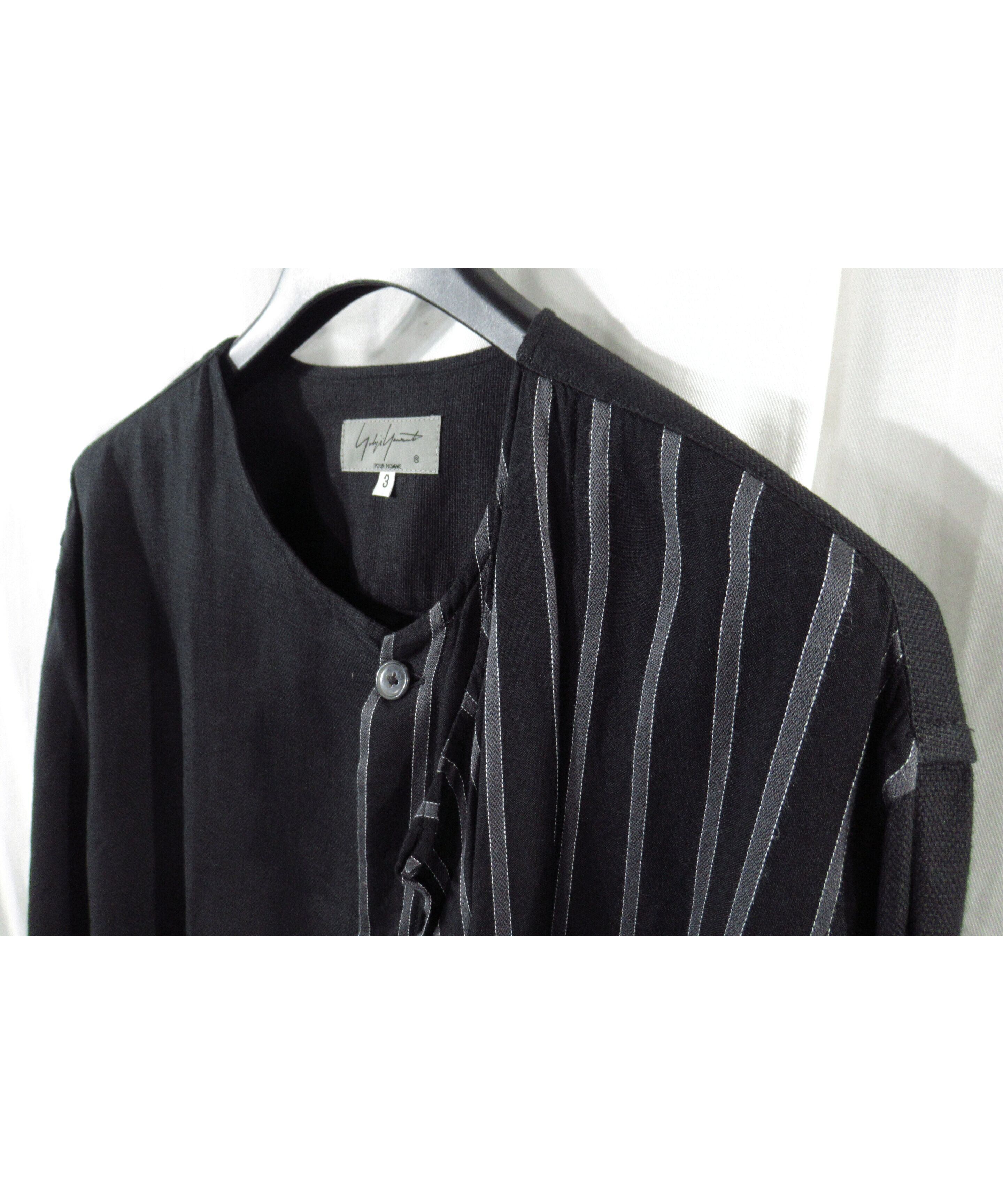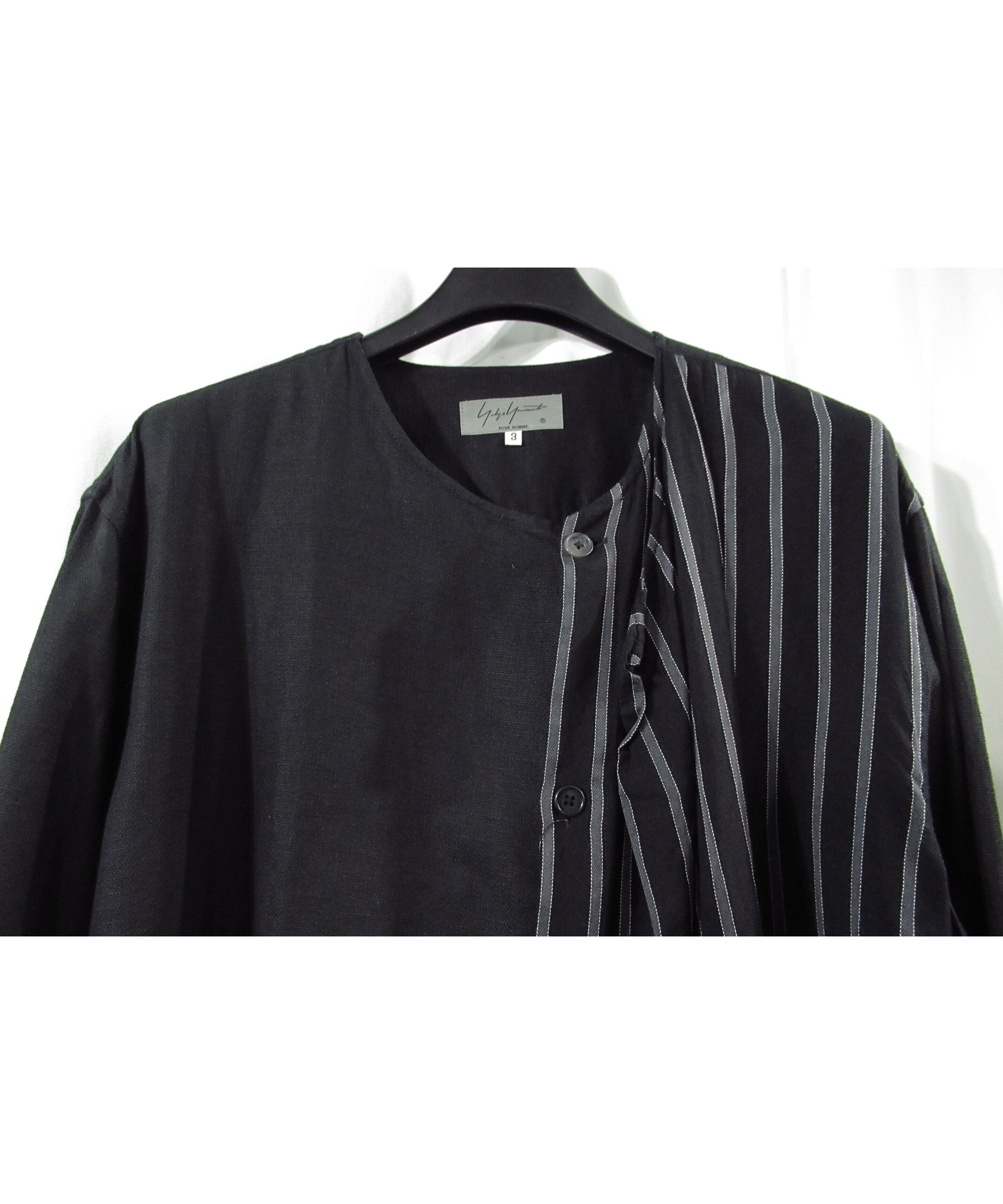 17ss yohji yamamoto pour homme 半身ストライプ レイヤードデザイン ノーカラーブラウス(HD-B25-809)